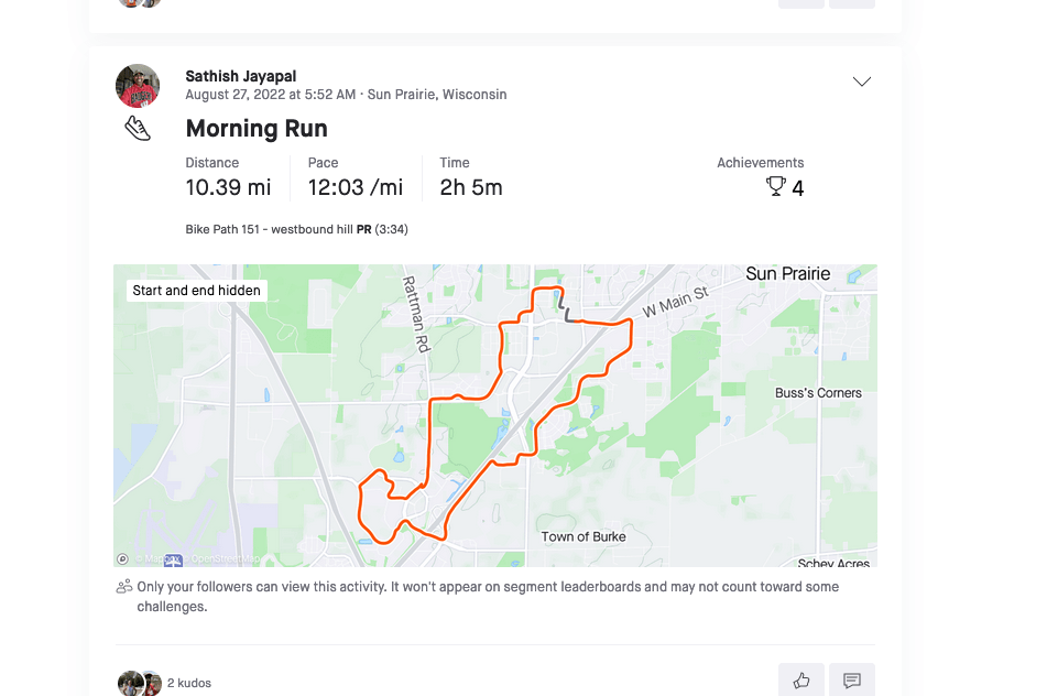 But as training matured, I was getting in Madison summer days. It is brutal to run during the hot days, and I had to wake up at 4:30 am to beat the heat. As I have not gotten used to my puppy runs, that was at any time of the day. These training runs were very long and took a long time for me. I was a happy runner doing miles around my neighborhood. But now the training plans made me look for longer routes. I started exploring the city and all the offerings. I did not care if it was the scenic route, paved road, busy school, etc. I just ran randomly and found some great courses in my neighborhood.