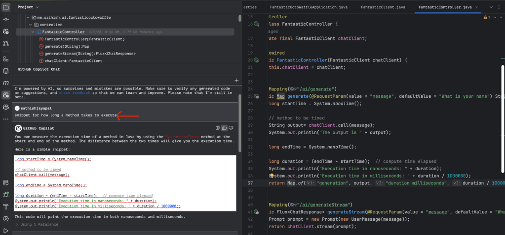 Now, here is an awesome titbit if you are using IntelliJ and have a sign-up with Github copilot for your development. The code block above lines 26-34 – performance measurement code was generated using the co-pilot prompt. Here is a screen print for which I asked the co-pilot to create the code.