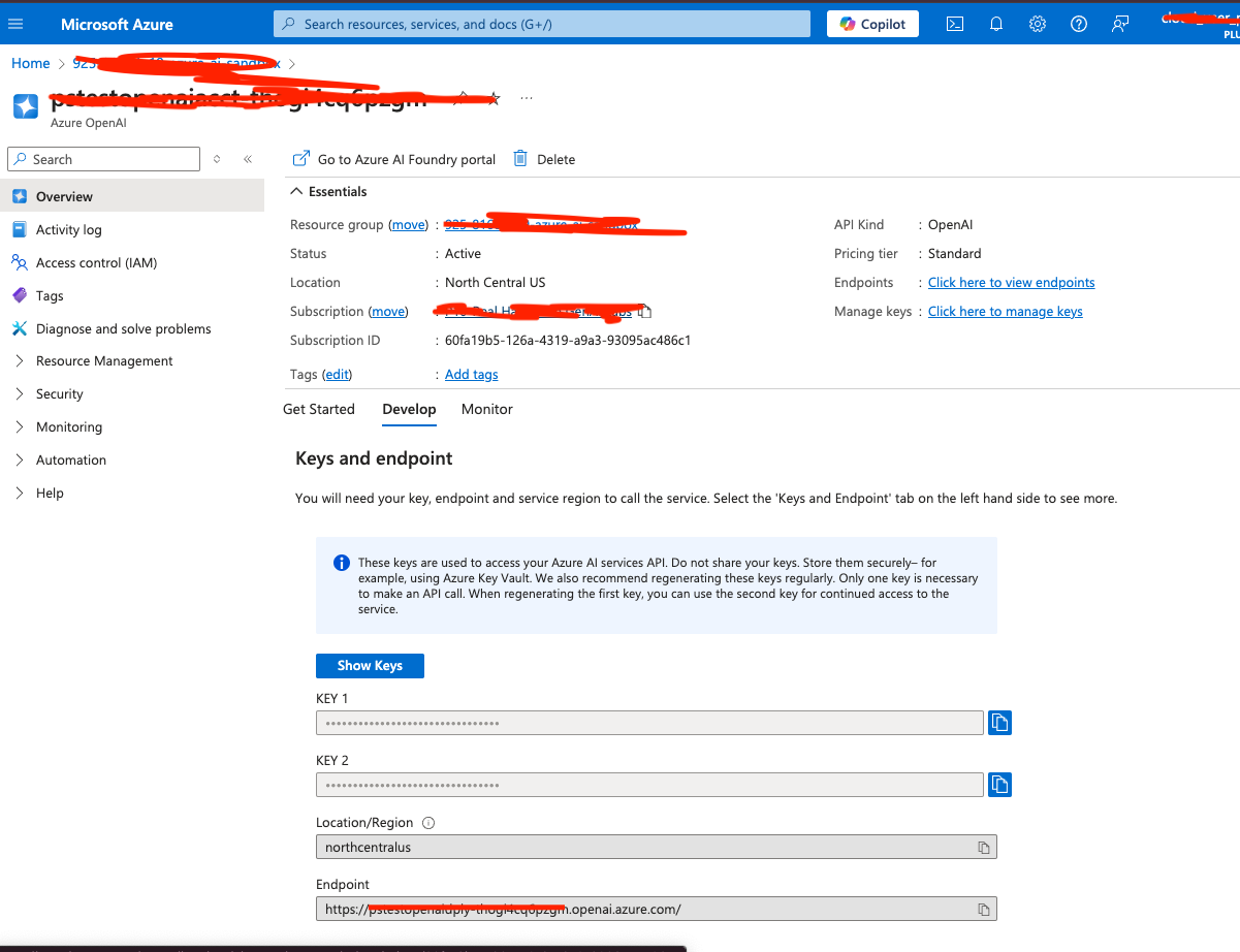 As shown keep a note of the key, URL information for the spring properties file. I’m using a restricted cloud sandbox, the only LLM model that I can use is the gpt-35-turbo model